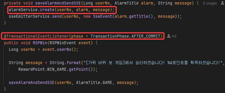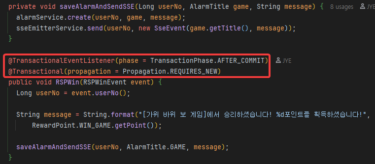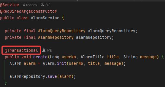 anoatation을 보면 이전 커밋이 이뤄진 후 트랜잭션 시작이 해당 메서드 부터 시작하는데, 이 트랜잭션 시작을 alarmService에서 시작하게끔 하면 끝이다. 다음을 보자.