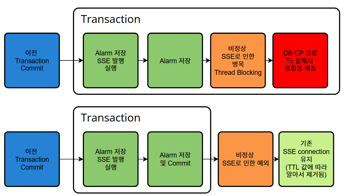 비록 핵심적인 비즈니스 로직에 대한 data 정합성은 아니라서 다행이지만 (이미 이전에 커밋되니까), 알람 자체가 db에 저장이 되지 않아서 Client가 alarm 내역을 보지 못하게 되는건 큰 불편사항중 하나일 것이다.