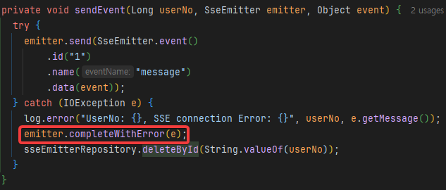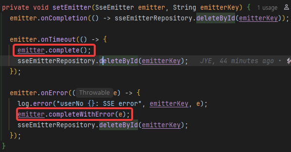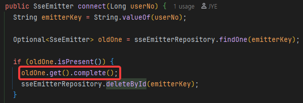emiitter 관련 해결책은 매우 간단하다. Map에서 삭제하기 전에, 해당 emitter의 종료를 Servlet에 알리기 위해 해당 emitter의 complete()메서드를 호출 한 후 Map에서 제거한다.
