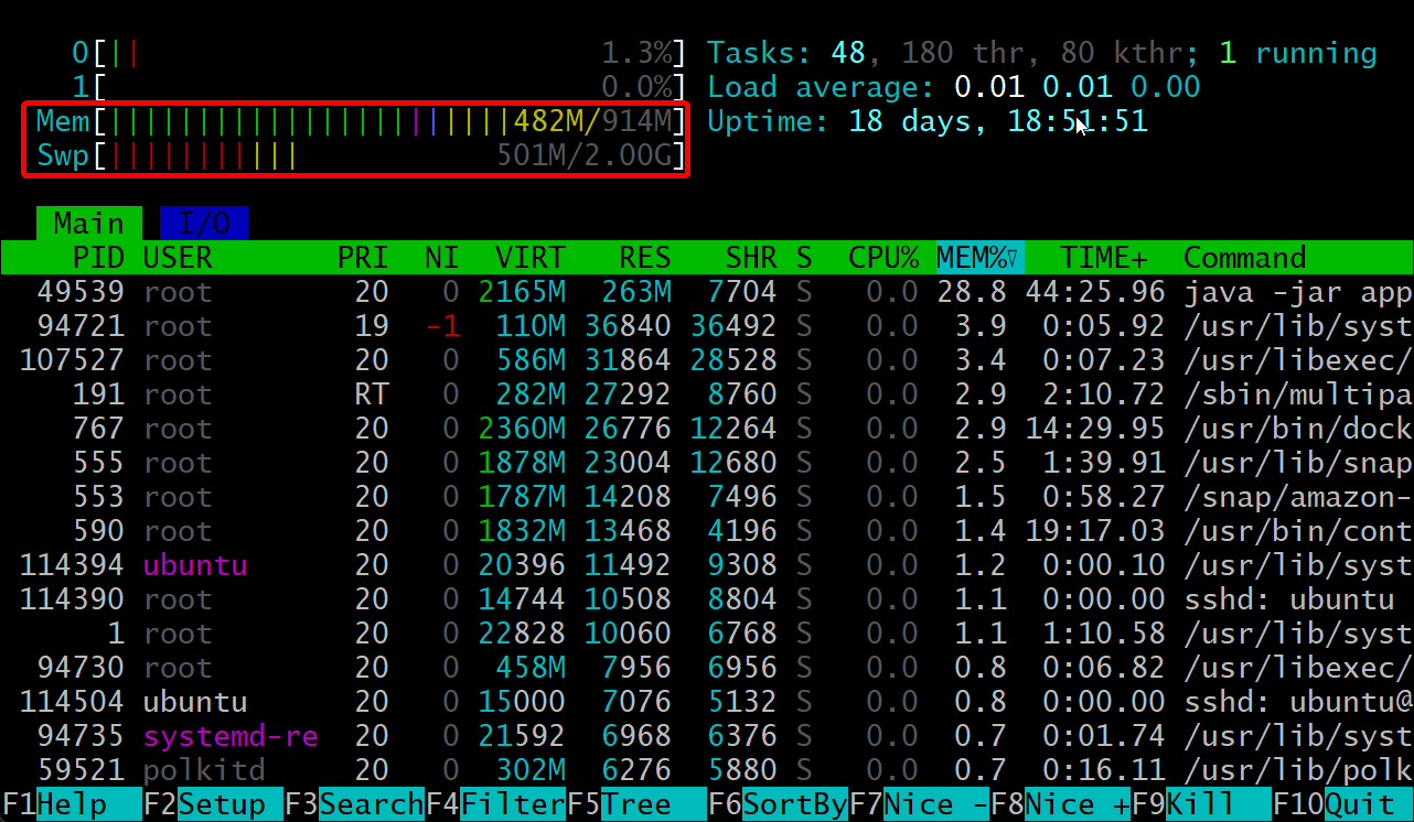 하루에 한번씩 서버를 확인하려고 htop을 딱 치는 순간, 메모리 사용량이 조금씩 늘어나고 있었고, 2 ~ 3일 지난후 어느 순간 내 서버는 접속자체가 안됐다.